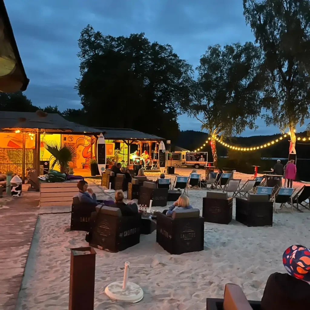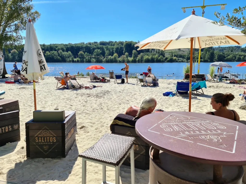 unsere Lounge bietet Platz für 80 Personen, auf trockenem feinen Sand. Eine Sonnentetrasse direkt am See bietet Sitzgelegenheiten für 60 Personen. Hier ist ausreichend Platz zum Chillen bei Sonnenschein, im Schatten oder auch im Trockenen mit Blick auf den Beach und aufs Wasser.