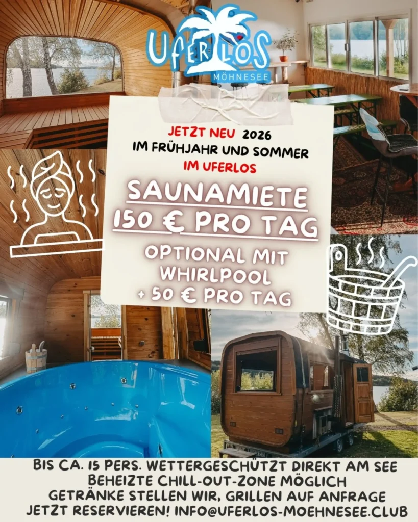 Du suchst eine besondere Sauna in Soest oder Umgebung? Willkommen im Uferlos Möhnesee! Ob exklusives Saunaerlebnis am See oder mobil bei dir zu Hause: Hier wird Entspannung zum Highlight!