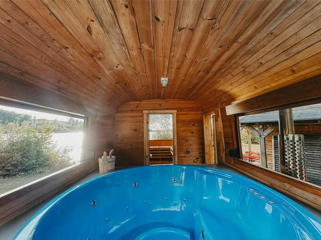 Die Panoramasauna am Möhnesee kombiniert modernes Design mit Natur pur. Sobald wir in die Saison starten, könnt ihr euch die Sauna auch für ein einzigartiges Erlebnis direkt am See sichern. Der integrierte Whirlpool sorgt für zusätzliche Tiefenentspannung, perfekt nach einem Saunagang oder bei Sonnenuntergang am See. Ganz für euch allein und ohne fremde Gäste.